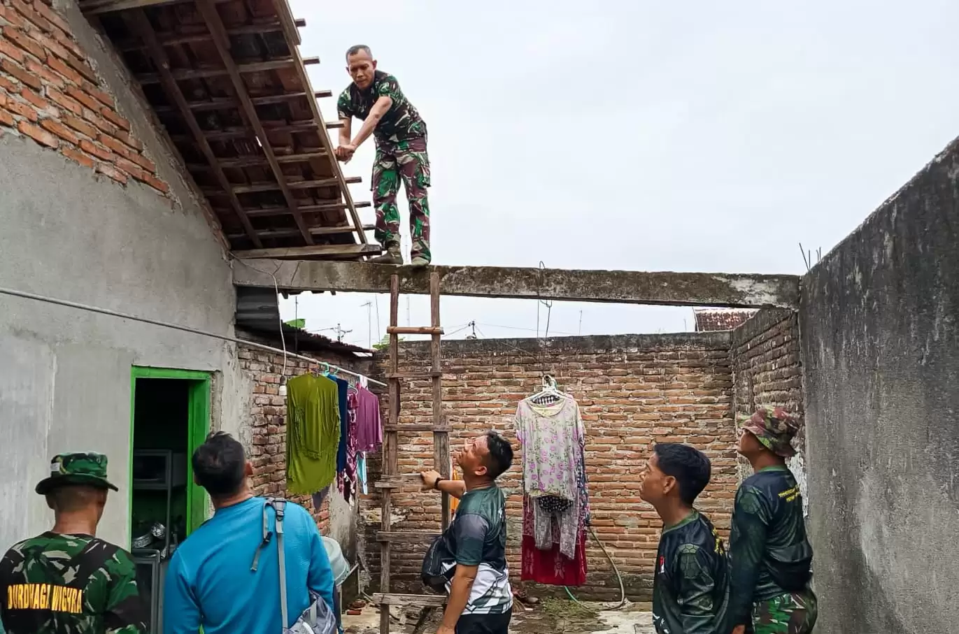 BOJONEGORO|| Penarealita.com - Babinsa Koramil 01/Bojonegoro Kodim 0813 Bojonegoro melaksanakan karya bakti membantu pemasangan genteng rumah warga yang rusak akibat hujan deras disertai angin kencang di Desa Campurejo, Kecamatan Bojonegoro, pada Selasa (30/9/2025).