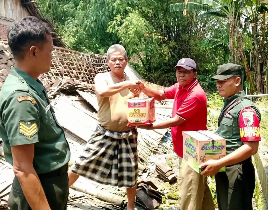 BOJONEGORO | Penarealita.com - Sebagai wujud kepedulian terhadap warga diwilayah binaan yang tertimpa musibah, Bintara Pembina Desa (Babinsa) Koramil 07/Kepohbaru Kodim 0813 Bojonegoro, menyerahkan bantuan sosial berupa sembako kepada Zaenuri (51) warga Desa Balongdowo Kecamatan Kepohbaru, yang rumahnya roboh akibat hujan deras disertai angin kencang.