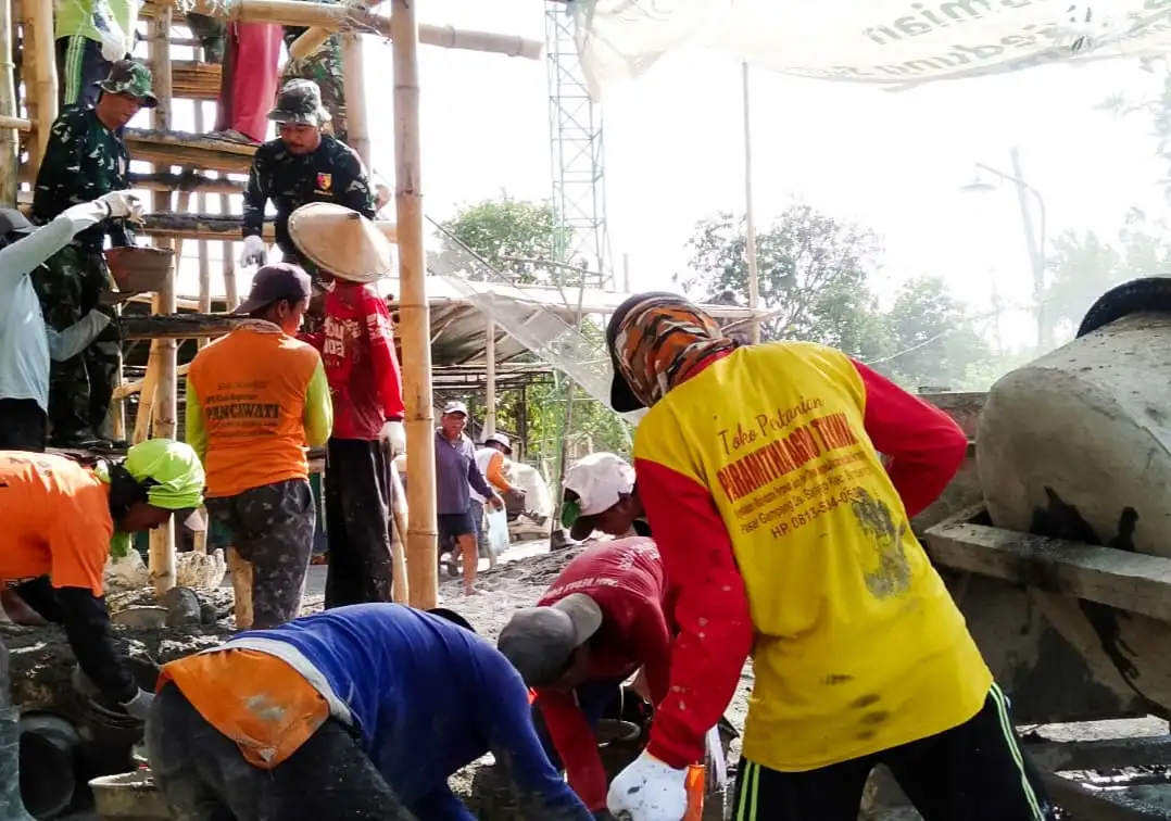 BOJONEGORO | Penarealita.com - Jajaran Bintara Pembina Desa atau Babinsa Koramil 09/Sumberrejo Kodim 0813 Bojonegoro bersama warga masyarakat gotong-royong membantu pengecoran pembangunan Masjid Baitul Muttaqin Dusun Barong Desa Ngampal Kecamatan Sumberrejo, Kabupaten Bojonegoro.