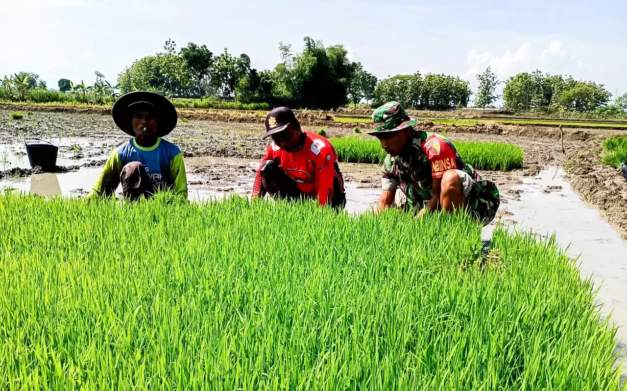 BOJONEGORO || Penarealita.com - Dalam rangka mendukung dan mensukseskan program pemerintah dibidang Ketahanan Pangan (Hanpangan), jajaran Babinsa Koramil 09/Sumberrejo Kodim 0813 Bojonegoro, menanam padi jenis inpari 32 bersama Kelompok Tani Rukun Sejati Desa Kedungrejo Kecamatan Sumberrejo.