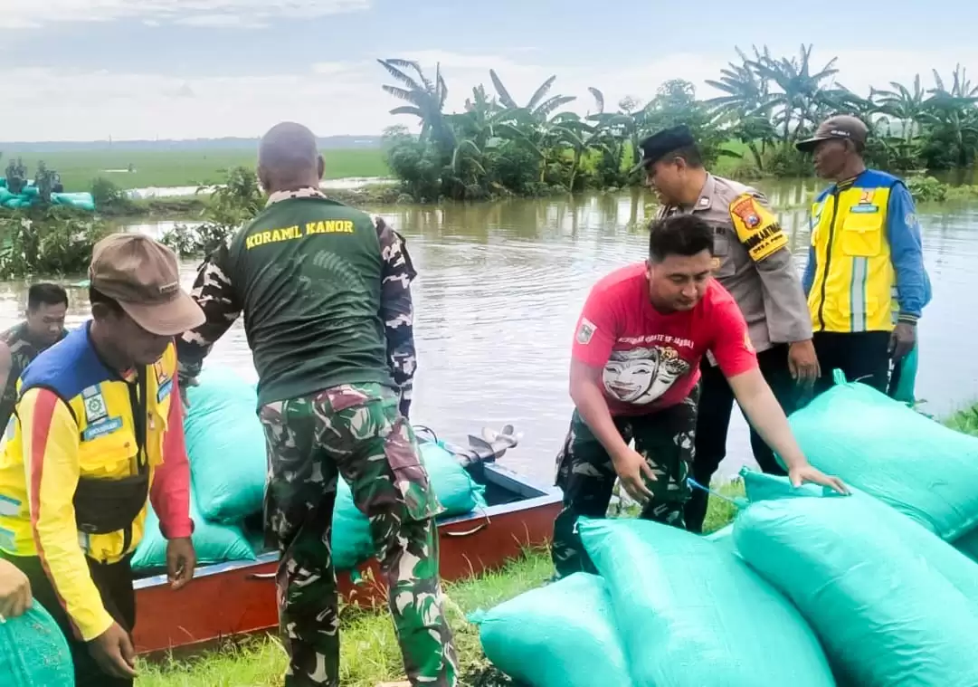 Bersama warga masyarakat setempat, personel TNI-Polri, BPBD, BBWS dan perangkat desa bergotong-royong berupaya membendung air yang mengalir deras menggunakan alat peralatan seadanya, seperti batang pohon bambu, sesek, terpal serta karung berisi tanah untuk penanganan darurat.