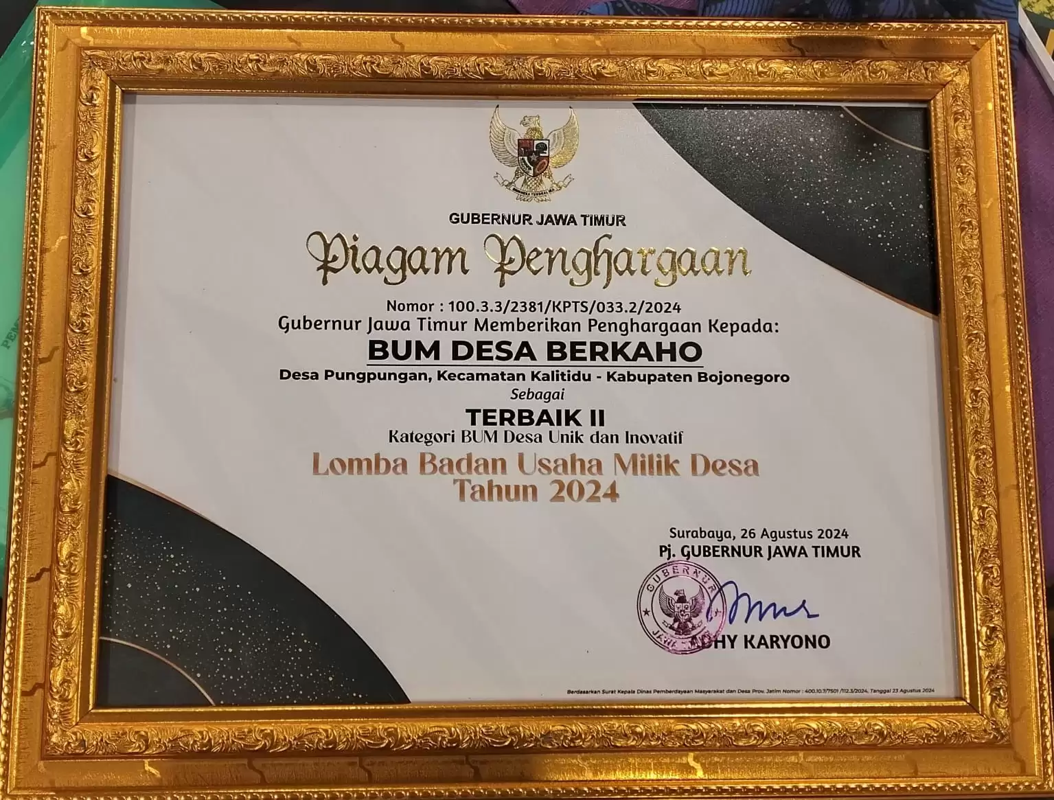 Pada kesempatan tersebut disampaikan penghargaan kepada 6 BUM Desa. Yakni dari Kabupaten Blitar, Jombang, Trenggalek, Nganjuk, Sumenep dan Bojonegoro. Dan BUM Desa Berkaho Desa Pungpungan, Kecamatan Kalitidu, berhasil meraih juara kedua untuk kategori unik dan inovatif.