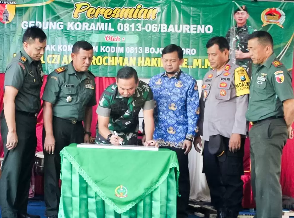 BOJONEGORO JATIM || Penarealita.com - Komandan Kodim (Dandim) 0813 Bojonegoro Letnan Kolonel Czi Arief Rochman Hakim, SE., MM., meresmikan bangunan baru kantor Markas Koramil 06/Baureno. Peresmian kantor yang terletak di Jalan Raya Bojonegoro - Babat turut Desa/Kecamatan Baureno tersebut, ditandai dengan penandatanganan prasasti, Rabu (19/6/2024).