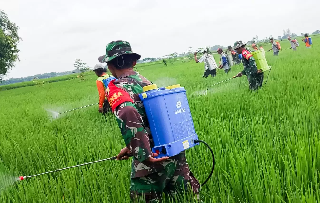 Dengan merebaknya serangan hama penggerek batang padi menyerang tanaman padi tersebut, bersama Tim Penyuluh Pertanian Lapangan (PPL), jajaran Babinsa Koramil 09/Sumberrejo Kodim 0813 Bojonegoro turun langsung kesawah membantu Kelompok Tani (Poktan) 'Karya Sakti' Desa Wotan mengadakan Gerakan Pengendalian (Gerdal) hama padi, Senin (20/1/2024).