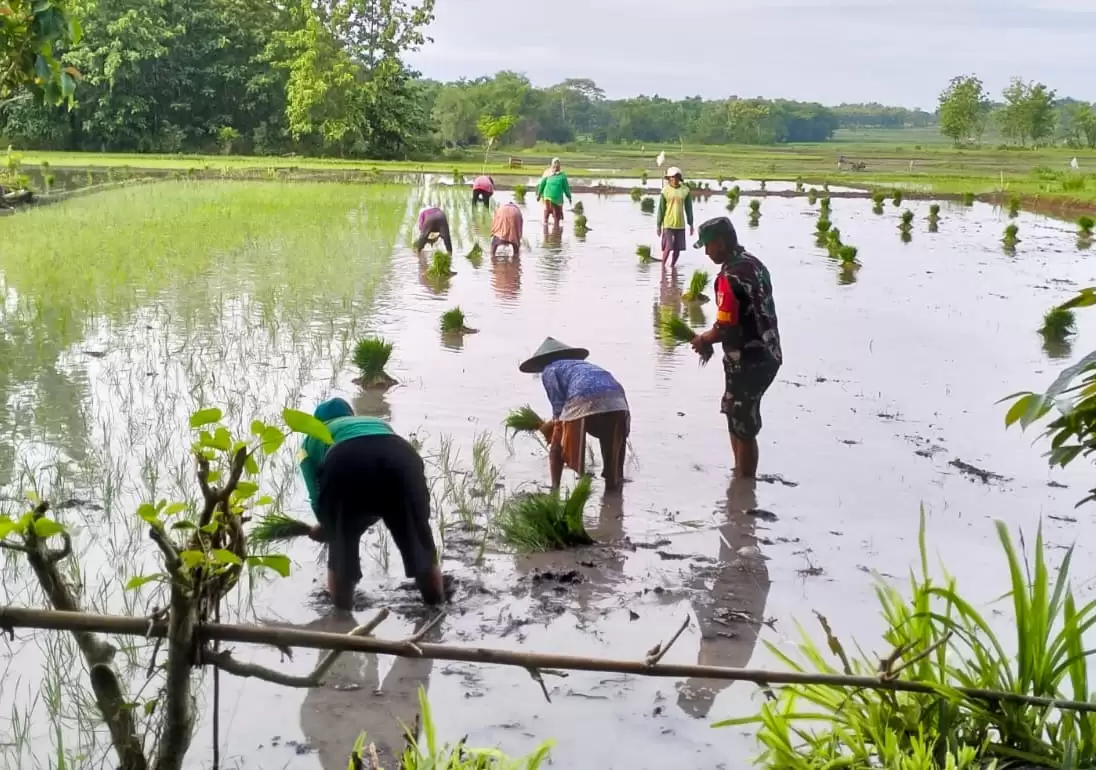 Pasalnya tanpa rasa canggung meski berpakaian dinas resmi, Serda Ahmad Wibowo, dengan celana disisingkan keatas langsung turut berbaur bersama para petani turun di areal persawahan milik Poktan Karya Utama untuk melakukan penanaman padi sesuai dengan arahan penyuluh dari Dinas Pertanian setempat.