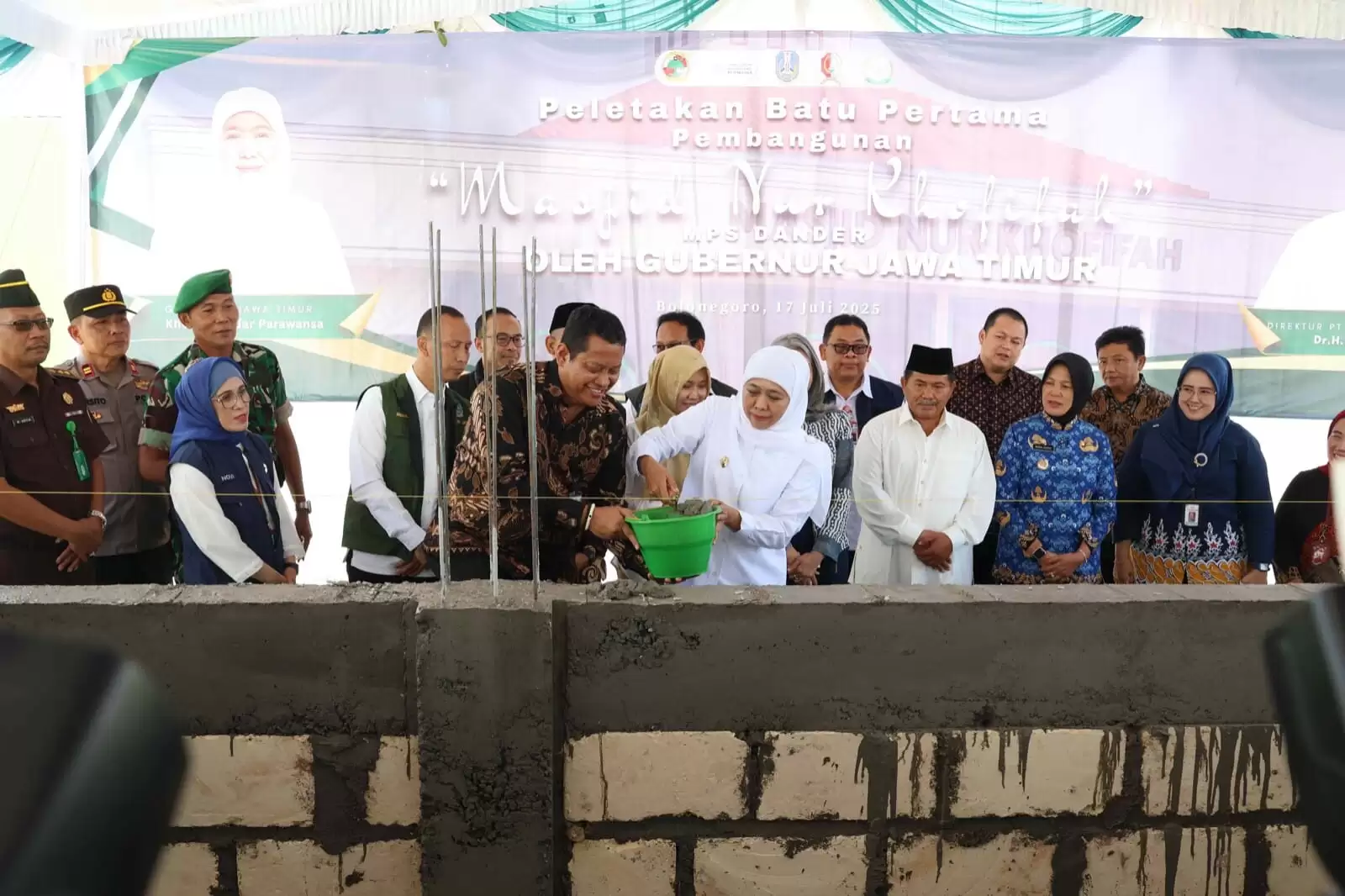 Diketahui Usai menyerahkan bantuan, Gubernur Jatim juga melakukan peletakan batu pertama Pembangunan majid Nur Khofifah di lokasi MPS Dander
