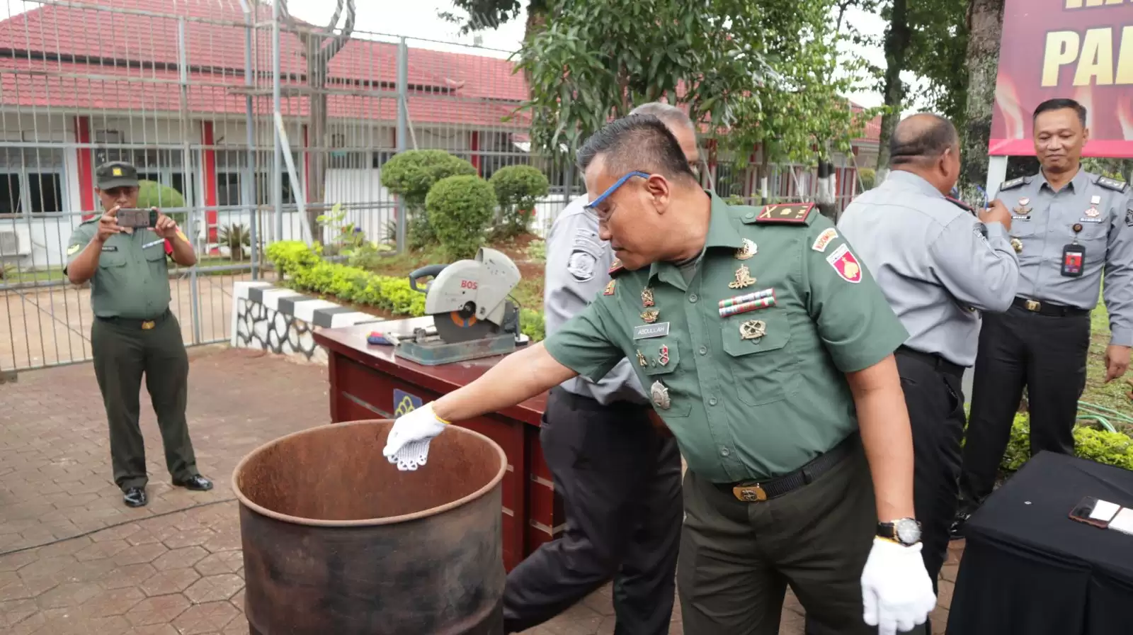 Pemusnahan tersebut, lanjutnya, diikuti seluruh tamu undangan, dimulai dengan menghancurkan ponsel dengan palu, dilanjutkan memotong senjata tajam kemudian membakar barang lainnya.