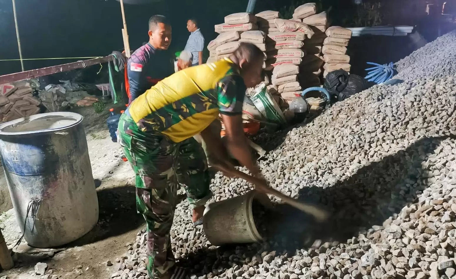 Personel Satuan Tugas (Satgas) TMMD ke- 125 Kodim 0813 Bojonegoro bersama warga masyarakat setempat melakukan kerja lembur untuk menyelesaikan target pembangunan tepat waktu. Mereka bekerja keras hingga larut malam, bahkan dengan penerangan seadanya, guna memastikan pekerjaan selesai sesuai jadwal.