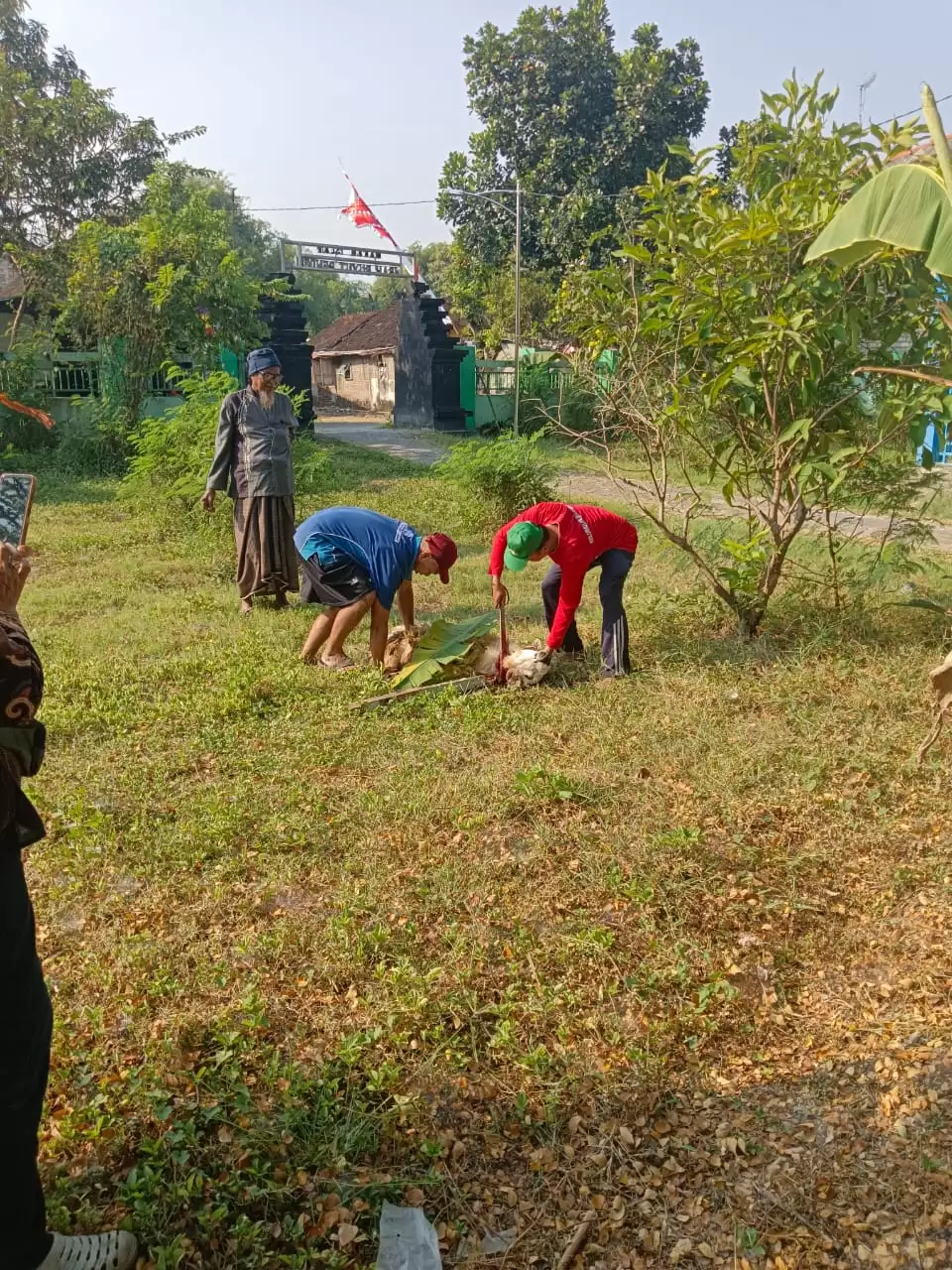 Tampak pada Kamis Sore tanggal 07/08/2025 mengawali rangkaian sedekah bumi disaksikan oleh juru kunci dihalaman makam *Mbah Sutowijoyo (Eyang Berok),* Modin Suhari melaksanakan penyembelihan seekor hewan kambing sumbang sihnya warga dari Bu Nanik Loestiani mantan Camat Balen.