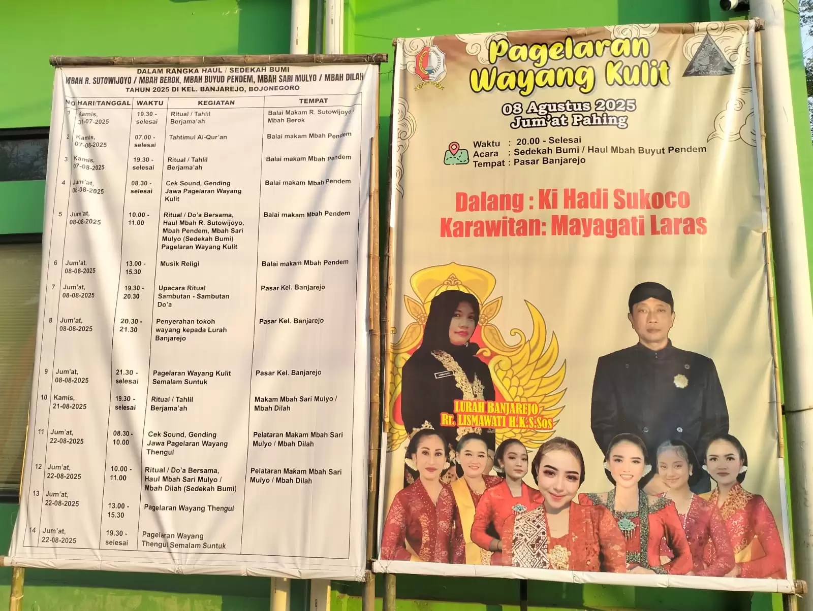 Disampaikan, bahwa gelar wayang kulit semalam suntuk pada nantinya akan dilaksanakan di dua tempat, yakni mulai tanggal 08/08/2025 Pagi hingga sore dilaksanakan di halaman Makam *Mbah R. Buyut Pendem dan makam Mbah Sutowijoyo (Eyang Berok),* dan untuk malamnya akan dilaksanakan di halaman parkir belakang Pasar Banjarejo. (Mur )