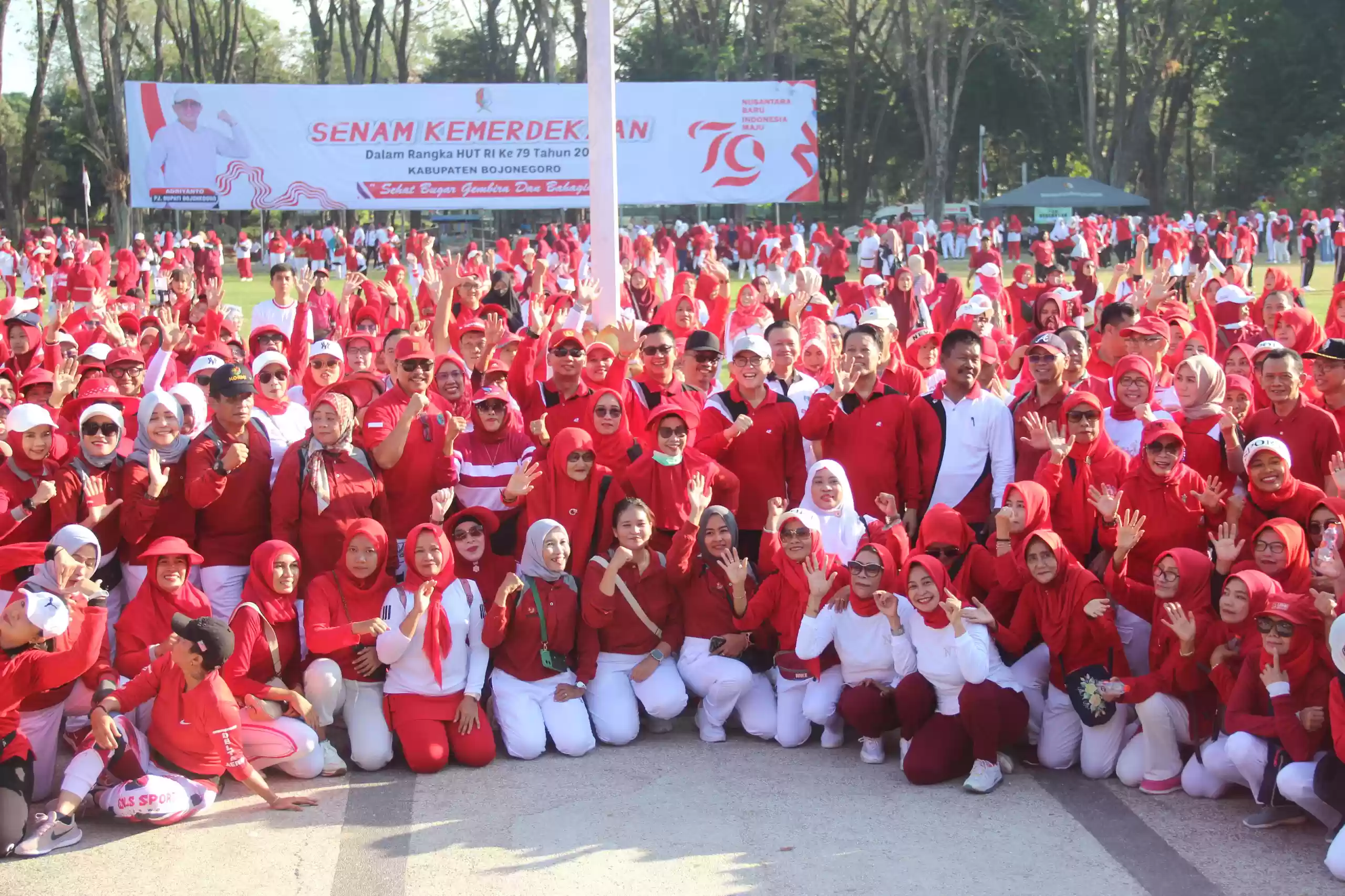 Senam Kemerdekaan diikuti peserta dari beragam kalangan. Mulai dari anggota komunitas senam, pelajar, mahasiswa, ASN, serta jajaran pejabat Pemkab Bojonegoro.