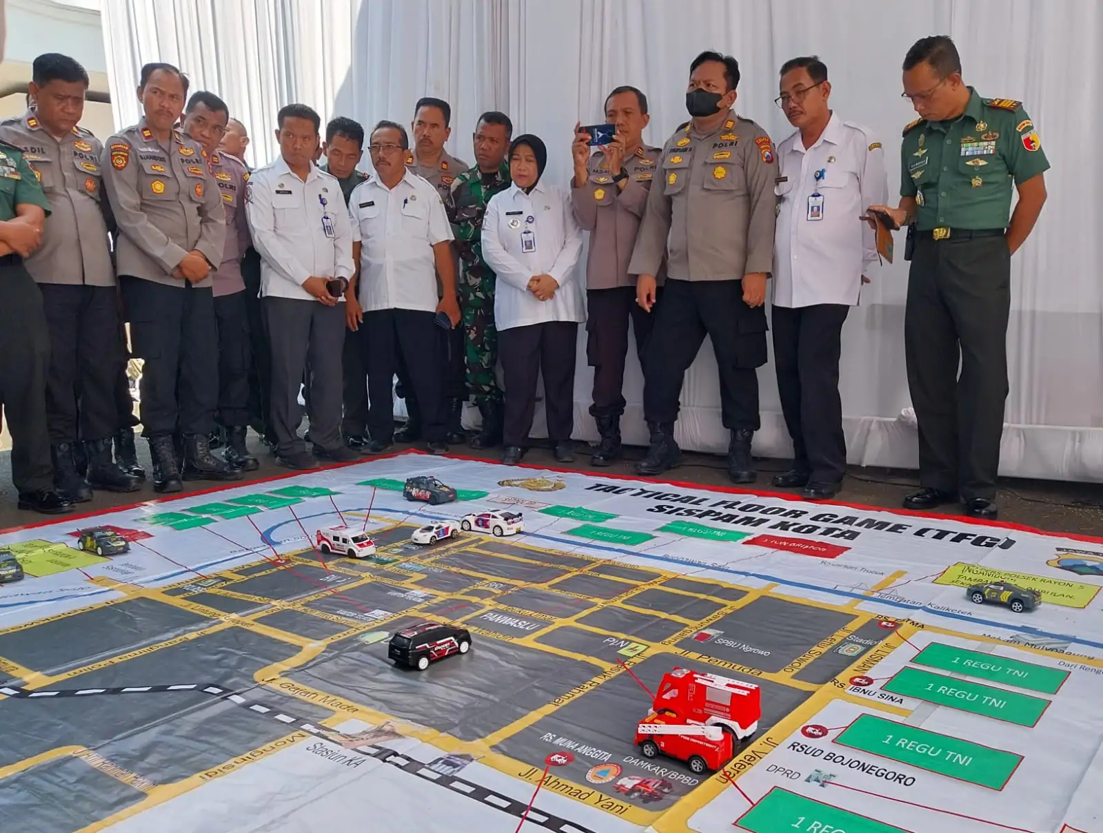 BOJONEGORO || Penarealita.com- Tactical Floor Game (TFG) Sistem Pengamanan Dalam Kota (SISPAMKOTA) menjadi rangkaian kegiatan awal saat Deklarasi Pemilu Damai Tahun 2024 dan Rakor Lintas Sektoral, Rabu (8/11/2023) di Pendopo Malowopati. Mapping tingkat kerawanan ini dalam rangka menjaga keamanan dan kondusifitas di wilayah Kabupaten Bojonegoro.