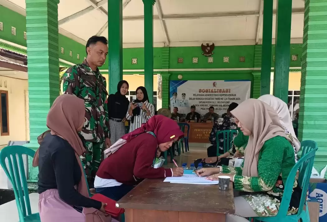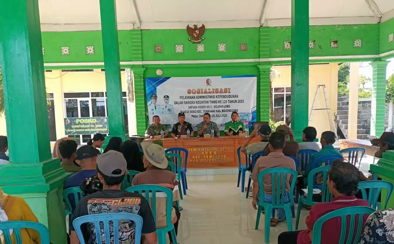 BOJONEGORO || Penarealita.com - Untuk mendukung kegiatan program TNI Manunggal Membangun Desa (TMMD) ke- 125, Pemerintah Kabupaten (Pemkab) Bojonegoro melalui Dinas Kependudukan dan Pencatatan Sipil (Dispenduk Capil) menggelar Sosialisasi Administrasi Kependudukan di Balai Desa Soko Kecamatan Temayang Kabupaten Bojonegoro Jawa Timur, Jum'at (25/7/2025).