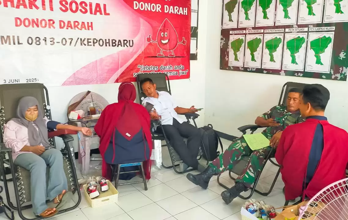 BOJONEGORO || Penarealita.com - Sebagai upaya meningkatkan kepedulian terhadap kesehatan masyarakat, sekaligus mendukung program kemanusiaan, jajaran TNI dari Koramil 07/Kepohbaru Kodim 0813 Bojonegoro menggelar kegiatan bakti sosial donor darah, Selasa (03/6/2025).