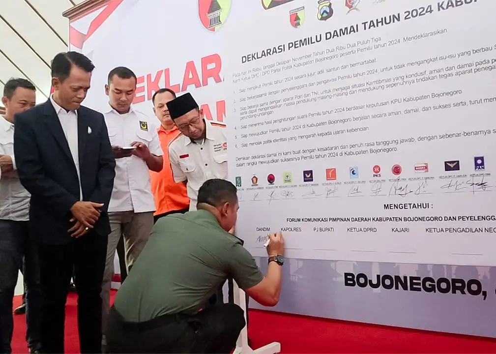 Komitmen deklarasi damai ini dituangkan dalam bentuk penandatangan Deklarasi Pemilu Damai dengan melibatkan berbagai unsur diantaranya jajaran Forum Komunikasi Pimpinan Daerah (Forkopimda), KPU, Bawaslu, Perangkat Daerah, partai politik peserta Pemilu, Mahasiswa, Ormas Keagamaan serta jajaran Forkopimcam se- Kabupaten Bojonegoro.