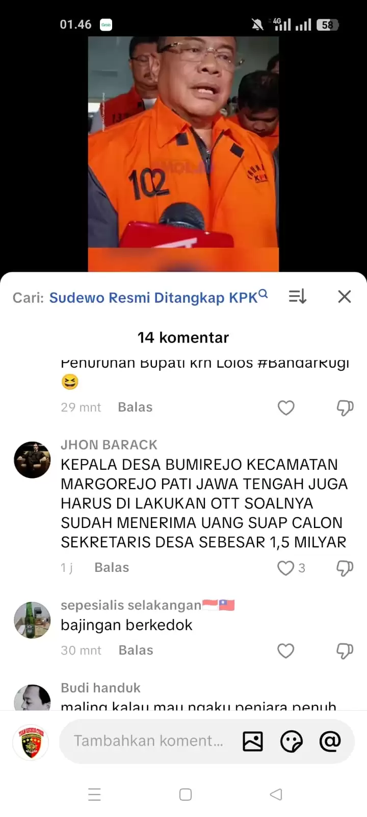 Salah satu sorotan datang dari akun TikTok Jhon Barack, yang mengomentari pemberitaan terkait Operasi Tangkap Tangan (OTT) KPK terhadap Bupati Pati dan tiga kepala desa. Dalam komentarnya, akun tersebut secara terbuka menyebut Kepala Desa Bumirejo, Kecamatan Margorejo, Kabupaten Pati, diduga kuat telah menerima uang suap sebesar Rp1,5 miliar dalam proses pengisian jabatan Sekretaris Desa (Sekdes).