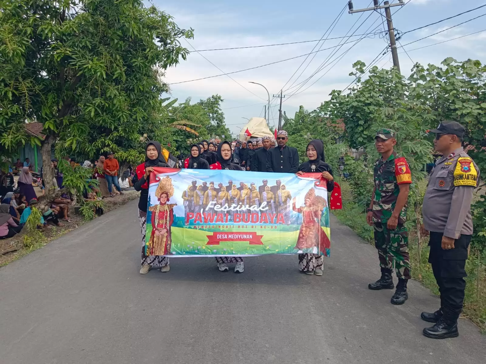 Pawai budaya ini menampilkan berbagai pertunjukan budaya yang memukau, seperti tarian tradisional, musik, dan kostum yang unik dan menarik. Acara ini dihadiri oleh Kepala Desa Mediyunan, Danramil, Kapolsek, serta berbagai organisasi dan kelompok masyarakat.