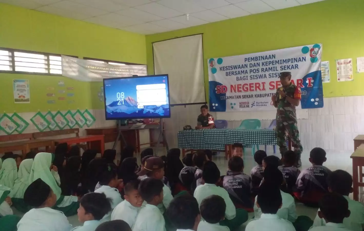 Bertempat dihalaman Sekolah Dasar Negeri (SDN) Sekar I Kecamatan Sekar Kabupaten Bojonegoro, sebanyak 70 siswa dan siswi dari kelas 1 sampai dengan kelas 6 dibekali materi Wawasan Kebangsaan (Wasbang) oleh para Babinsa, Rabu (19/11/2025).